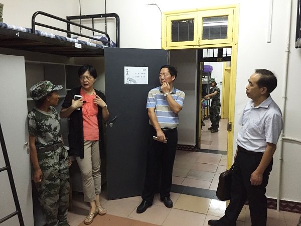 在一区一栋女生宿舍,屈院长、李书记和付书记对照宿舍门上贴的门牌,一一询问新生姓名和毕业学校。“我看了你的军训日记写的很好,感情很真挚,从第一篇到最后一篇我每天都在关注,从日记中看到你的成长和进步很开心”。在法学四班郭格同学的寝室,付书记与郭格同学聊起军训日记中的内容,并鼓励她大学四年要好好学习,综合发展。在少数民族同学考沙尔的寝室,屈院长和李书记仔细询问她的生活情况,并希望寝室同学之间互相尊重民族习惯,互相帮助,把寝室建成“温馨、整洁、团结、舒心”的家。走访过程中,团委书记杨凯向各位领导汇报了 海角社区