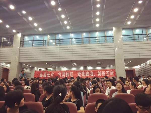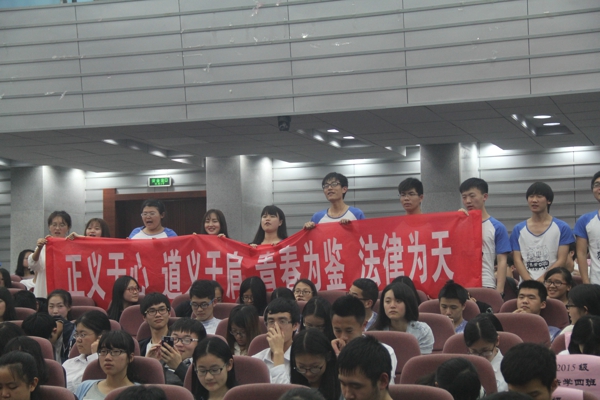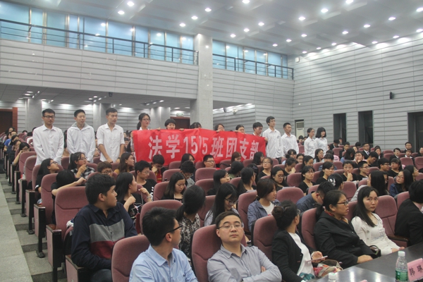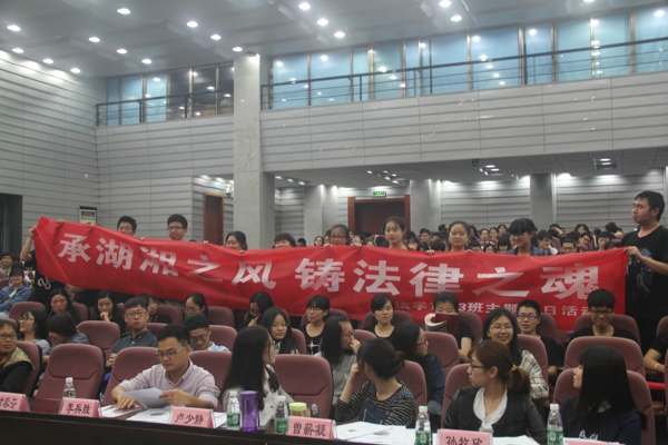 大会在雄壮的国歌声中正式开始。首先,主持人介绍了答辩程序、评分细则和奖励办法,随后各支部进入答辩环节。参加最佳主题团日的答辩来自2015级的四个支部, 他们分别从支部情况及特色、活动过程、活动成效、活动宣传等方面对本支部开展的主题团日活动进行了详细阐述。参加答辩的各支部紧紧围绕社会主义核心价值观,以“抚今惜古,用脚步丈量历史”、“走进特殊学校,建设爱心支部”、“承湖湘之风,筑法律之魂”、“缅怀革命先烈,弘扬爱国精神”等为主题,开展了一系列内容丰富、形式多样、意义深刻的活动。台上答辩的同学们通过PPT向老师和同学们展示支部活动的风采,台下的同学们也通过呼喊口号、歌唱班歌、挥舞标语等方式为班级加油助威,整个答辩现场气氛隆重而热烈。