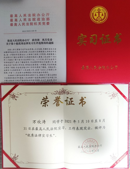 万欣涛同学在会后对讲话精神及实习生活进行了回顾和总结,他提到:“公平、正义、自由、平等、法治这些词汇永远能让我心尖发烫,这不仅仅是自然法虚幻的指引,更是最高人民法院不断推行改革所捍卫的精神。实习期间,我亲历了最高人民法院秉持司法为民而进行各项司法体制改革,见到了立案庭为回应人民关切而大力推动一站式多元解纷和诉讼服务体系建设,见识了法官们为保障人民权利而宵衣旰食。在实现党第二个百年奋斗目标的新画卷上,人民法院必将书写更加浓墨重彩的印记,为全面依法治国贡献更多“中国之治”的法治经验,我为能够奋斗在这样的好时代而感到充满无限希望和力量。我相信当下司法实践存在的问题,总会得到妥善解决,因为有太多法律人正怀揣着热忱和信念在为之奋斗。实现身边处处是榜样,他们秉持司法为民的理念、发扬勤奋敬业的精神、拥有严谨细致的作风,我为能向他们学习而感到骄傲和自豪。我要用这段经历在心头烙下印记,努力成才,争取发展为德才兼备的高素质法治人才,无论以后立身于何处,置身于何地,牢记在最高人民法院实习的体悟,带着强烈的历史使命感和责任感,积极投身于法治中国的建设。