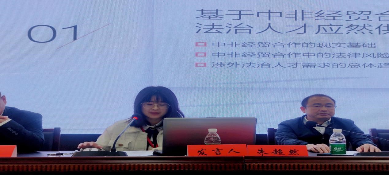 硕士培养质量的肯定。其中李小明教授指导的朱超然同学撰写了《新时代涉外法治人才培养模式探究——基于中非经贸合作人才需求分析》,荣获本次会议二等奖,并在“湘非经贸合作的法治保障与人才培养”主题研讨会做学术发言。论文和发言围绕湖南省中非涉外法治人才培育问题及相关对策提出进行阐述,获得了在场专家学者的一致认可。