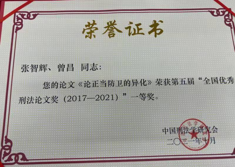 张智辉教授、曾昌博士研究生合著《论正当防卫的异化》一文被评为第五届全国优秀刑法论文奖(2017-2021)一等奖, 海角社区