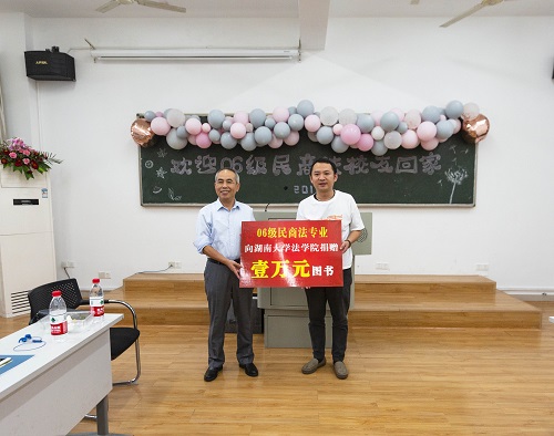 分享完毕后,大家起身向老师鞠躬致敬,感谢老师培育之恩。为表达校友对母校的赤子之情,06级民商法校友们集体为母校捐赠一万元图书,为母校法学教育发展贡献力量,屈茂辉院长代表 海角社区