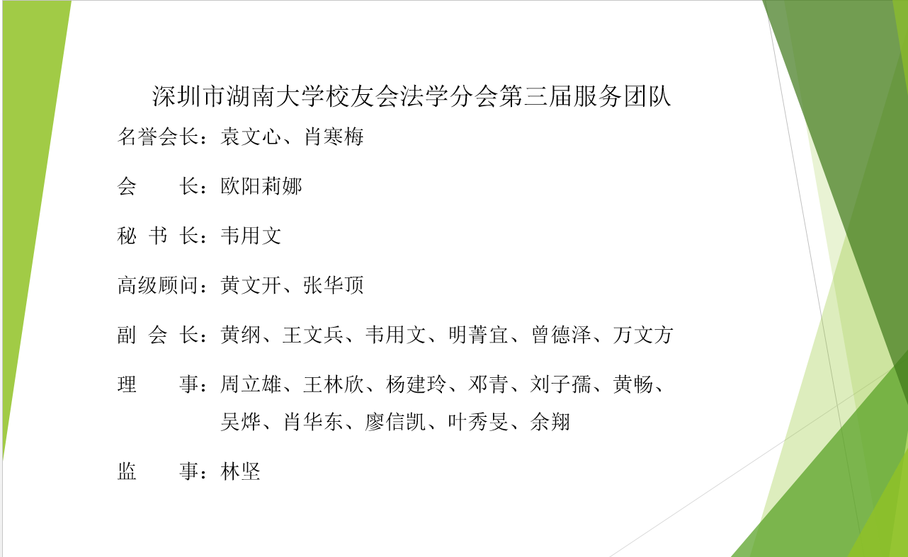 奖学金工作,为更多勤奋、努力、专注、诚信的法学学子提供帮助,二是深挖先行示范区、粤港澳大湾区的法律服务潜力,为湖大人、法学人提供更多的实习、就业机会,三是搭建更为广阔、开放的服务平台,为在深圳、在广东的湖大人,探索跨专业、跨行业的双向、多向互动,互补互动、携手共进。