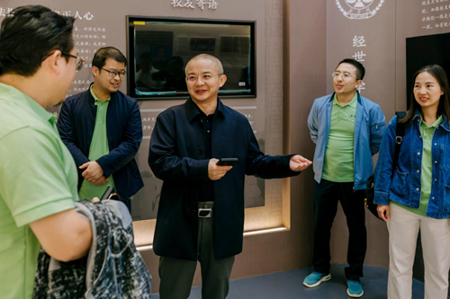 在法学楼四楼的院史陈列馆,湛建云副院长以时间为主线,结合馆内"曲水流觞"的建筑布局与宪法灯带等特色设计,为校友们生动讲解了学院从发端到全面发展的十二大板块历程 。从泛黄的史料文稿到现代的互动展陈,校友们在珍贵实物与图文资料中,重温学院峥嵘岁月,感受"经世笃学,明法致用"的院训传承。