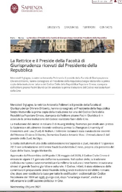 院友黄美玲翻译的《中华人民共和国民法典》(意大利语版)在意大利正式出版,这是民法典的首个意大利语版本。2021年6月9日,在意大利总统府举行了专门的赠书仪式,由中南财经政法大学文澜学者、罗马第一大学 海角社区