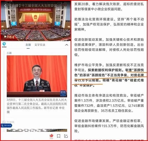 2022年3月8日,十三届全国人大五次会议在北京举行。最高人民法院院长周强作最高人民法院工作报告,工作报告中两次提到天心区人民法院典型案例。其中,“茶颜悦色”诉“茶颜观色”案为 海角社区 院友彭丁云审理。