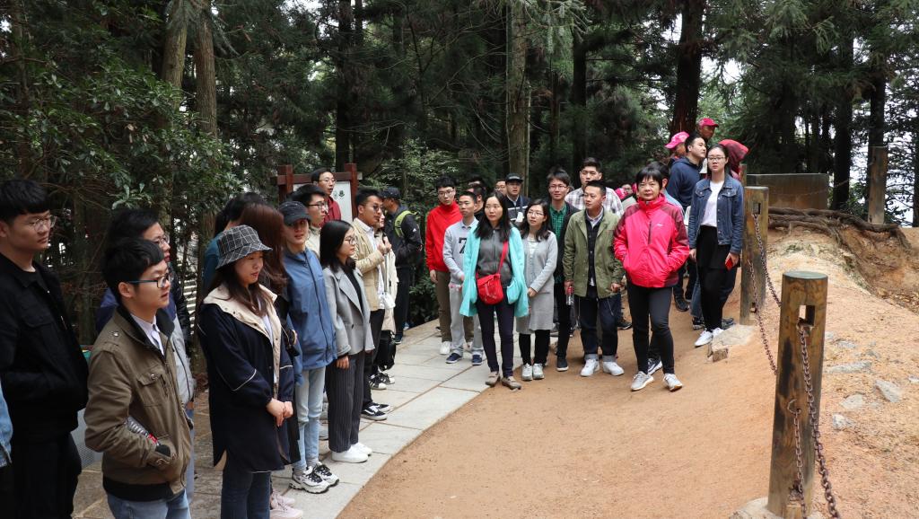 15日上午,培训班一行驱车沿盘山公路来到海拔一千多米的黄洋界哨口继续开展实地教学。黄洋界地处湘赣边界,是井冈山革命根据地五大哨口之一。1928年8月,著名的黄洋界保卫战在此打响。学员们先后来到作战壕、炮台、防御工事等遗址参观,并集体朗诵毛主席的《西江月·井冈山》。“‘山下旌旗在望,山头鼓角相闻’的井冈山时期,艰苦卓绝,物资何其匮乏,毛主席却将新领的棉衣赠予贫农御寒,自己只穿两层单衣;朱总司令与战士们一同挑柴担米,‘朱德的扁担’至今被人铭记。作为‘中国革命的摇篮’,井冈山光辉的斗争实践,生动诠释了‘中国的红色政权为什么能够存在’”,授课老师向同学们介绍了发生在井冈山革命斗争时期的感人故事,带领学员们体验挑梁小道,教育同学们要传承宝贵的井冈山精神。