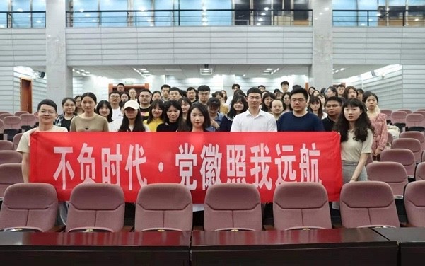 2021届毕业生党员 “不负时代.,党徽照我远航”主题党日活动暨毕业生党员党组织关系转接培训在法学楼报告厅拉开序幕。活动由党务干事成凤仪老师主持,副处级组织员马启明、党务与学生工作办公室主任刘岳峰及所有2021届毕业生党员参加了活动。
