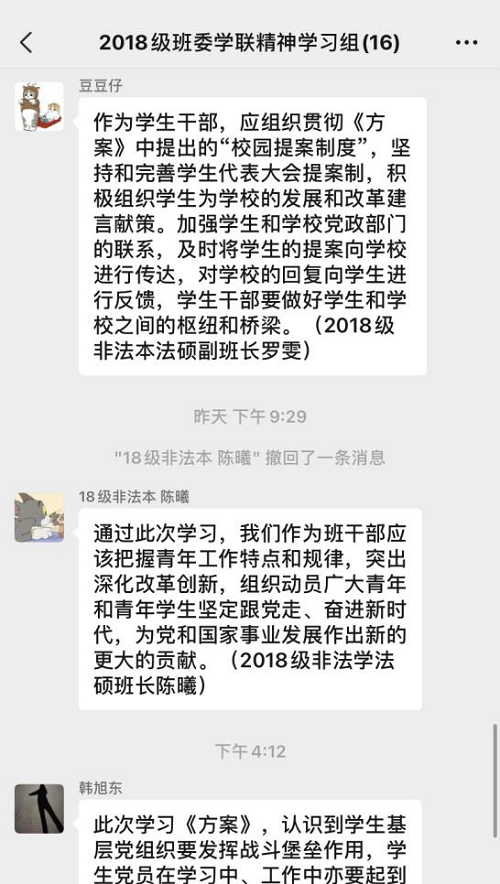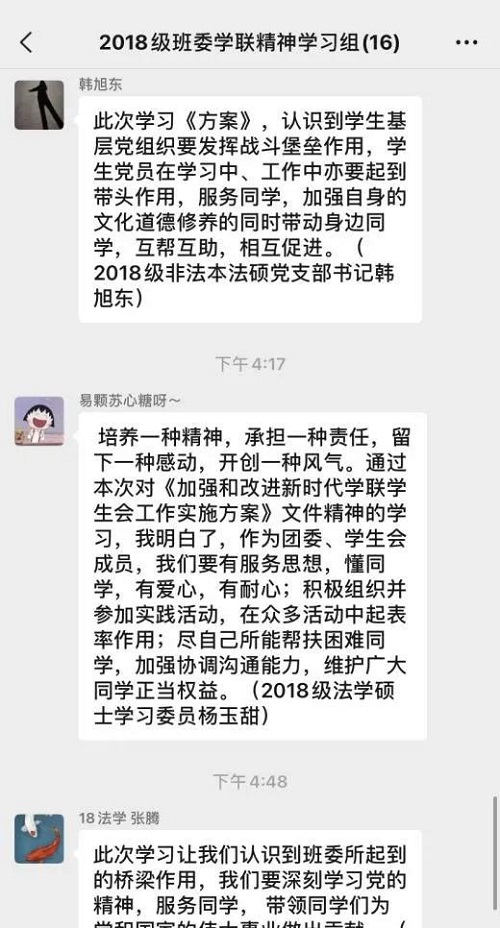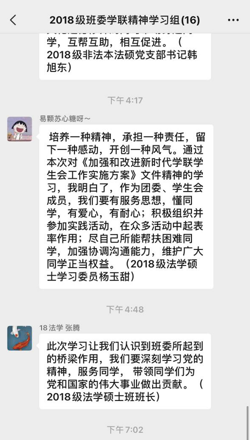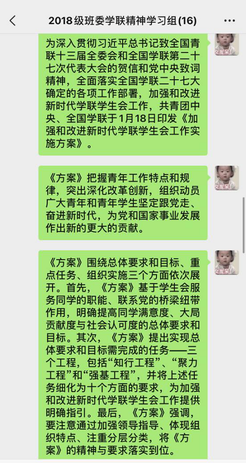 班委在微信群就《学联学生会工作实施方案》展开了交流学习,在会议讨论中大家都畅所欲言,从我们作为班委的角度出发,讨论了对《方案》中个别条款的想法以及具体实施建议。其中就学生干部为何以及如何杜绝“官僚化”现象进行了讨论,作为学生干部的我们应找准自身定位,心中时刻铭记我们是为同学服务的群体,要谦虚要接地气更要充当好学校和学生间桥梁的作用。彼此会议学习更让我们理解了学生干部的职责和作用,希望在今后的工作中可以一直保持初心,服务同学,共同构建和谐友善的学校环境氛围。