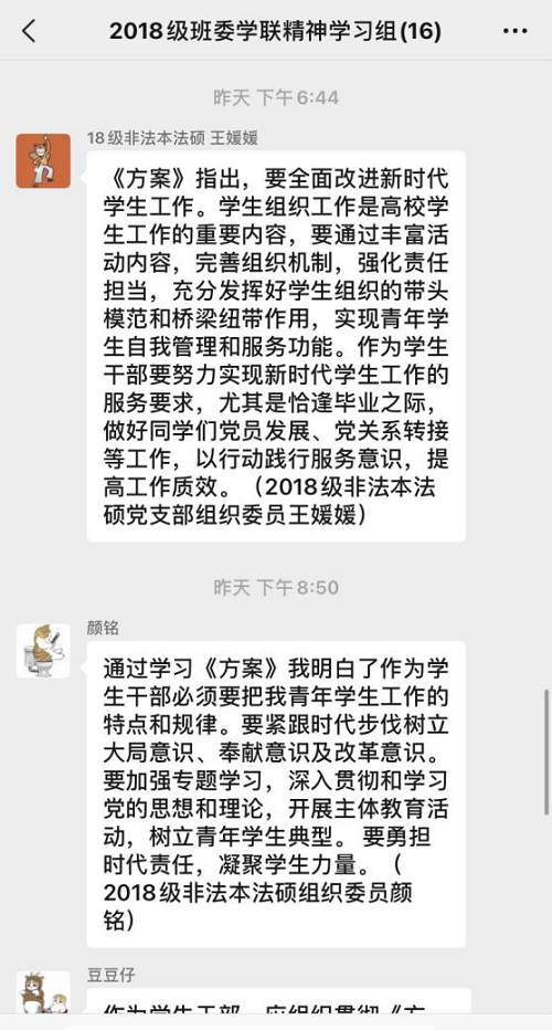 通过深入学习《加强和改进新时代学联学生会工作实施方案》,对习近平总书记关于青年工作的重要思想和关于教育的重要论述有了进一步的了解和认识,我明白了党支部活动的开展不能脱离青年学生活动的特点和规律,要着力服务于广大同学的普遍性需求,要不断提升同学满意度、大局贡献度和社会认可度。因此,在日后的党支部活动中,法本法硕班将紧紧围绕这三个要求,在丰富活动载体的同时寓教于乐,使得党员同志深入学习贯彻习近平新时代中国特色社会主义思想,学习党史、新中国史、改革开放史、社会主义发展史,将爱国爱党和爱社会主义高度统一。