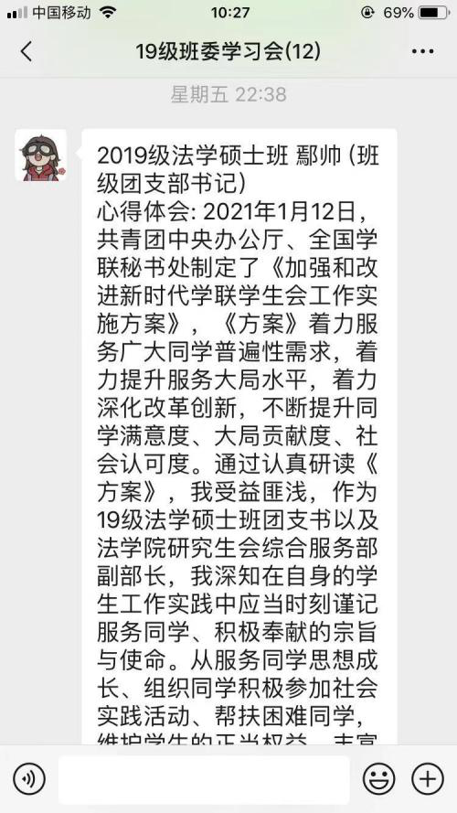 2021年1月12日,共青团中央办公厅、全国学联秘书处制定了《加强和改进新时代学联学生会工作实施方案》,对该方案的学习使我感到非常受用。作为2019级法律硕士(非法学)班级团支部书记,我应当有服务思想,懂同学,有爱心,有耐心;积极组织并参加实践活动,在众多活动中起表率作用;尽自己所能帮扶困难同学,加强协调沟通能力,维护广大同学正当权益。在各方面都起到带头作用。本次对文件精神的学习,提醒了我要时刻坚持公平、公正的原则,全心全意为同学们服务的宗旨。牢记使命、努力作为、服务同学、不断奋斗。以实际行动成为同学们的表率。