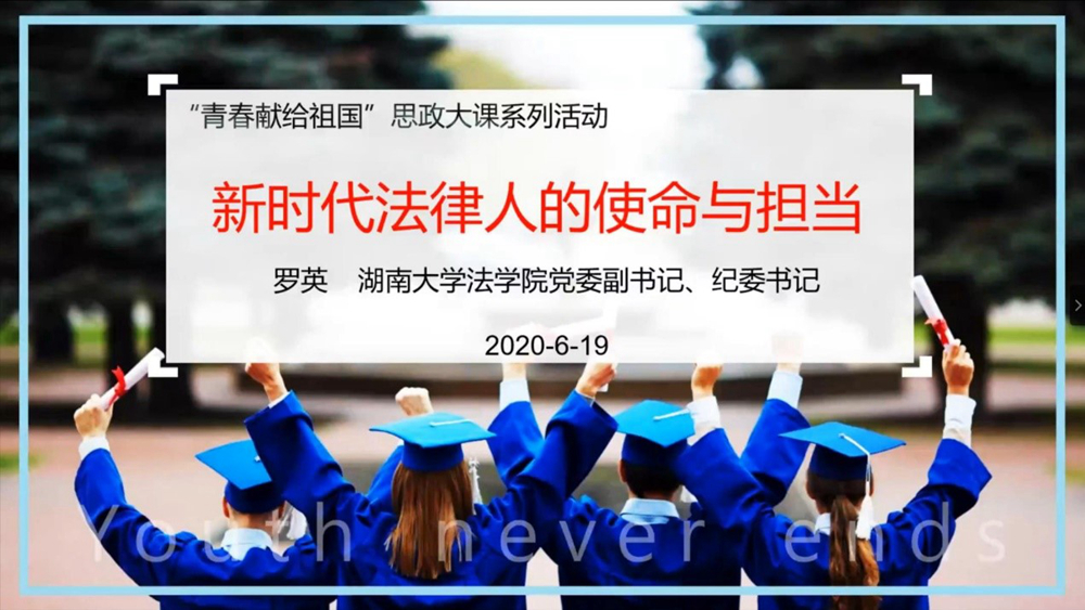 2020年6月19日下午,学院举办了“青春献给祖国”思政大课系列活动,由学院党委副书记、纪委书记罗英老师为毕业生主讲了“新时代法律人的使命与担当”的线上思政课。