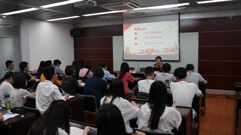 党委副书记、副院长付蓉芬以“学习宣传贯彻党的十九大精神和习近平新时达中国特色社会主义思想”为题,为毕业生主讲了一堂精彩的党课。付书记首先带领大家回顾历史,引用毛泽东、邓小平和习近平三位领导人的语录,介绍了在我们党的带领下中国经历站起来、富起来再到强起来的光辉历程,同时从小康建设的未来“两步走”方针、坚持改革开放的经济发展战略、齐心共筑中国梦的伟大目标以及中国正逐步走向世界舞台中心的外交成就等方面论证了中国特色社会主义建设已经进入了新时代的理念,其与大变革、大发展、大融合以及世界充满不确定性与不稳定因素的时代特点共同构成了党的十九大的召开背景。