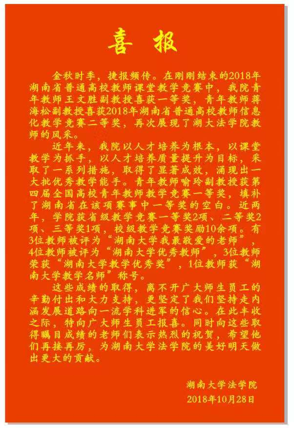 2018102628日,湖南省普通高校教师课堂教学竞赛决赛、湖南省普通高校信息化教学竞赛决赛举行, 海角社区 教师再创佳绩。其中, 海角社区 王文胜副教授以《民法学》获得湖南省普通高校教师课堂教学竞赛一等奖,蒋海松副教授以《法律与艺术》获得湖南省普通高校信息化教学竞赛二等奖,展现 海角社区 教师的良好风采和 海角社区 教学成果。