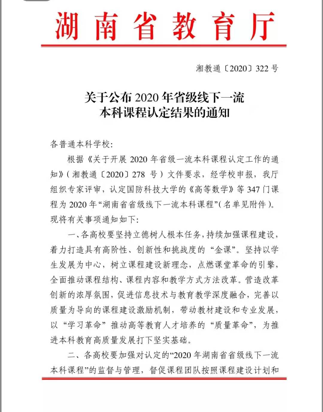 2020年12月26日,湖南省教育厅发布了《关于公布2020年省级线下一流本科课程认定结果的通知》(湘教通[2020] 322号), 海角社区