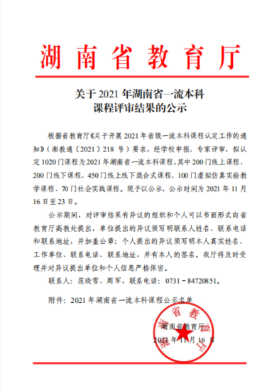 近期,湖南省教育厅发布了《关于公布2021年省级一流本科课程评审结果的通知》, 海角社区