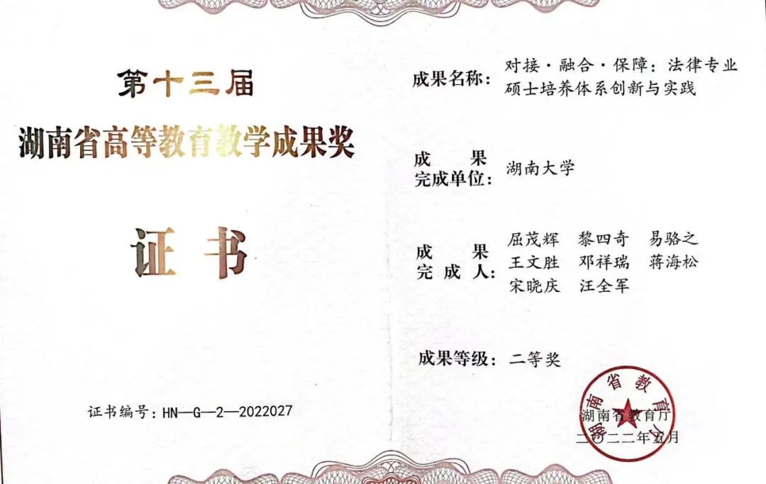 共两项成果获奖。其中,喻玲教授团队开展的“德法兼修 理实一体 业技融通:法学教育‘共进式’育人育师新模式的探索与实践”项目与屈茂辉教授团队开展的“对接·融合·保障:法律专业硕士培养体系创新与实践”项目分别喜获省级一等奖和省级二等奖。