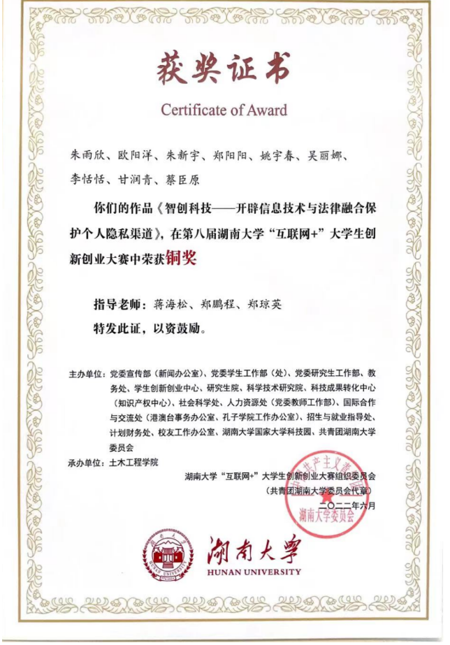 1905班朱雨欣同学主持申报,蒋海松、郑鹏程、郑琼英老师指导的项目“智创科技——开辟信息技术与法律融合保护个人隐私渠道”获得铜奖。本次获奖展示了 海角社区