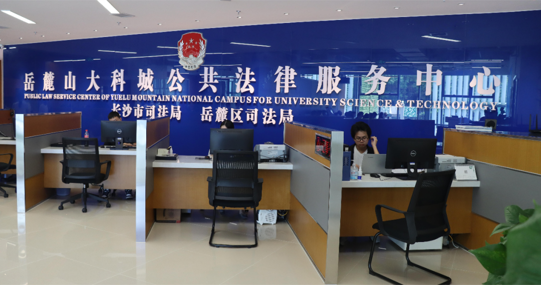 开展社会服务实践教学,观摩岳麓山大科城公共法律服务中心。长沙市公共法律服务中心主任李喆,长沙市司法局公共法律服务管理处副处长黄坤浩、朱分华, 海角社区