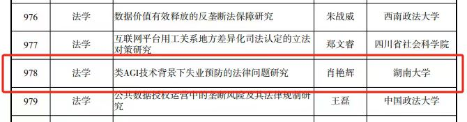 肖艳辉老师申报的“类AGI技术背景下失业预防的法律问题研究”获准2024年度国家社科基金一般项目立项。这是肖艳辉老师在2022年刚完成了国家社会基金一般项目《权利二分法的局限与社会救助权及其保障的再解释》的基础上又添国家一般项目的立项成果。