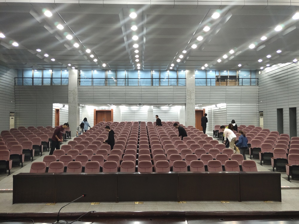 由于模拟法庭和报告厅日常使用频繁,室内地面较脏,同学们的重点是清扫地面垃圾,在这同时,他们还将座位间残留的纸屑、水瓶等杂物一一清除,面对一些平时不常使用导致积灰的地方,女同学们用抹布仔细清扫,直到一尘不染。