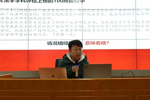 保研至中南财经政法大学知识产权法的赵陶钧就知识产权法方向分享自己的看法。他强调,在保研择校问题上应慎重思考自己未来研究及就业意向,并勇敢追求。同时,他向同学们分享保研信息的获取途径,提醒同学们充分发挥互联网的作用。