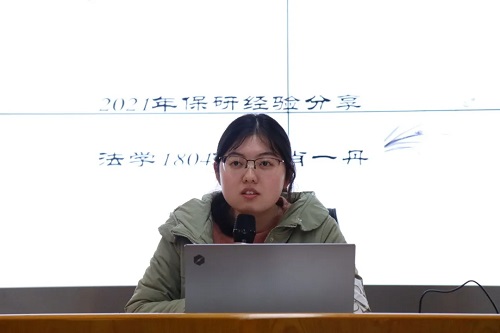 “长风破浪会有时,直挂云帆济沧海。”这是保研至武汉大学民事诉讼法方向的苏靖雯给同学们的寄语。此次交流会中,她主要从保研准备和参营经历两方面进行分享。结合自己的保研经历,她向同学们详细罗列大学各阶段需要准备的材料,同时提醒同学们注重专业课学习、论文和专著阅读。她提醒同学们,只有提高个人实力,才能在参加夏令营与其他高校优秀学生同台竞争时脱颖而出。