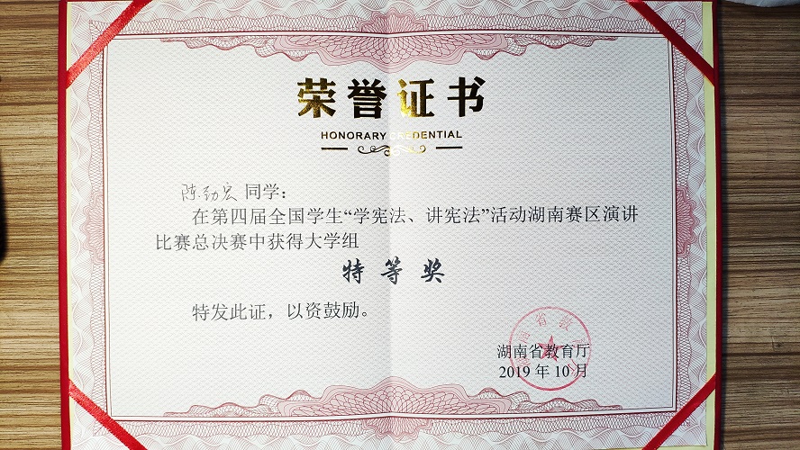 法学专业后,始终心怀法治信仰,先后在街道办事处、律师事务所、基层人民法院、高级人民法院实践实习和挂职锻炼,并作为今年全国仅有的3名本科生之一,通过团中央“扬帆计划·中央和国家机关大学生实习计划”进入最高人民法院实习,以专业知识和实践之行服务人民的经历。陈劲宏同学的演讲获得了评委的一致好评,经过激烈的角逐竞争,以大学组总分第一名的成绩一举夺得特等奖。