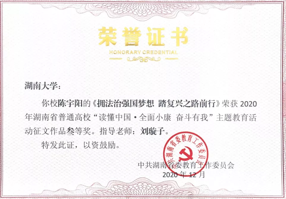 获评优秀组织奖,多位2018级本科生获不同级别奖项。1805班陈宇阳征文作品《拥法治强国梦想 踏复兴之路前行》获教育厅三等奖及 海角社区