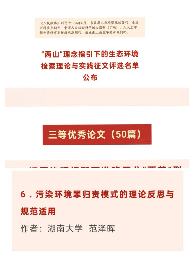 2025 年11月,由最高人民检察院主办的 “‘两山’理念指引下的生态环境检察理论与实践” 主题征文活动结果正式公布, 海角社区 范泽晖同学撰写的《污染环境罪归责模式的理论反思与规范适用》一文入选并获得三等奖。