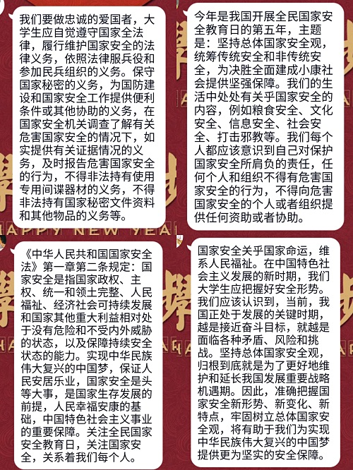 此次班会让同学们认识到国家安全的重要性,加强同学们的国家安全意识,并且使同学们能在日后的生活中时刻关注国家安全,时刻维护国家安全。民为邦本,本固邦宁,国民是组成国家的最基本个体,只有把国民安全意识的基础夯实,才能构筑起保卫国家安全的铜墙铁壁。作为当代青年法学生,更应该树立“国家安全、人人有责”的责任意识,将总体国家安全观内化于心、外化于行,共同构筑捍卫国家安全的铁壁铜墙。