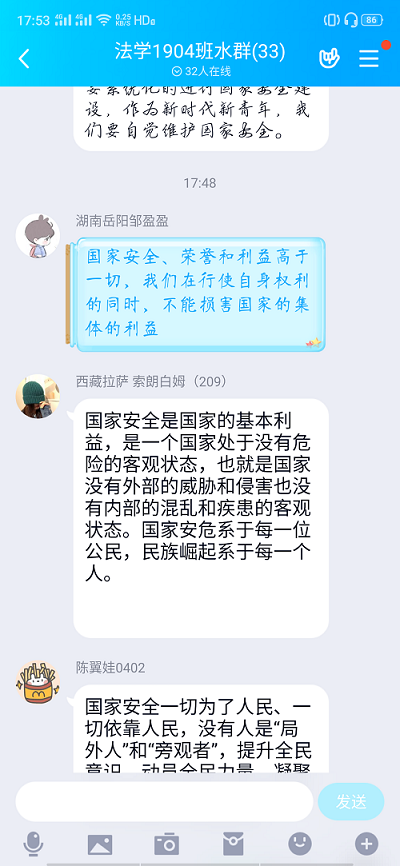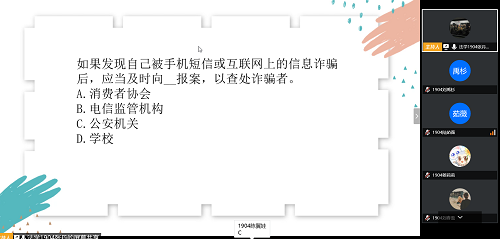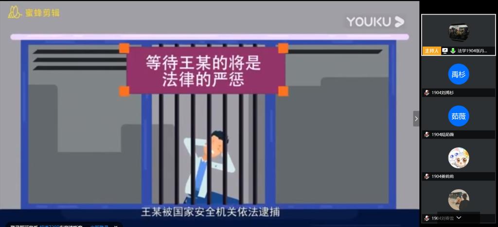 此次活动于线上利用腾讯会议等媒介开展,由团支书张丹同学担任主持,法学1904班同学全体参加。活动伊始,张丹同学从国家、历史、社会、个人等方面向大家介绍国家安全教育的相关内容和重要性,扩展同学们对国家安全的认知,使同学们深入了解国家安全教育日开展设立的重大意义。随后,通过欣赏一段国家安全教育日宣传影片,加深大家对国家安全丰富内涵的了解,该影片将国家安全与法律相结合,理论知识与历史发展相融合,易于接受,同学们在增强爱国主义精神的同时学习到《中华人民共和国反间谍法》《中华人民共和国消防法》等与法学专业有关的一系列知识和规定。