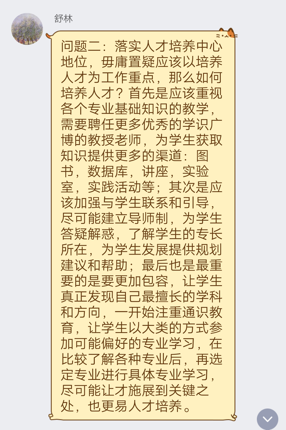 会后,针对会议主要内容,同学们展开思考并积极发表自己的观点,对学校人才培养工作的情况以及措施等方面提出建议。晋偌林同学发表观点:“发挥青年党员、干部的作用,多促进经验分享等形式的交流活动,以输出倒逼输入,促进学生群体的整体成长。”她通过阐述党员、学生干部在立足本职岗位、落实人才培养上的作用,向学校与学院人才培育政策提出建议,强调人才培育工作需要各个群体的配合与共同努力。
