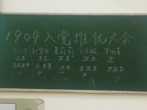 竞选发言结束后,班长刘磊与团支书曹雨欣在法学1904班团支部全体同学和组织部金博涵同学的监督下,组织全班进行无记名投票并现场唱票,以保证推选结果公平、公正、透明。到会同学认真聆听5位同学的发言,并结合参选同学的的平时表现,投出了神圣的一票。应学院要求,具有参选资格的同学获得的选票超过参会同学人数的半数即可视为推优成功,因此此次参选的5位同学均推优成功。
