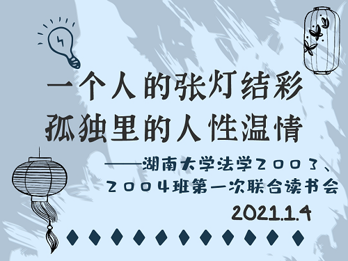 法学2003班、法学2004班全体同学于2021年1月4日晚在南校区综合教学楼举行了第一次联合读书会。法学2003班学习委员李子韩、法学2004班学习委员杨仁共同担任主持人。毛靖雯和卢检花、陈慧婷和蒋婕、俞嘉莉和邹倩懿、张丽媛和刘潇潇、刘宇芩和杨仁总共十名同学组成了五个分享小组。