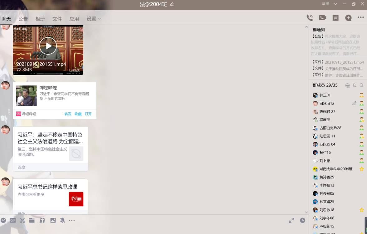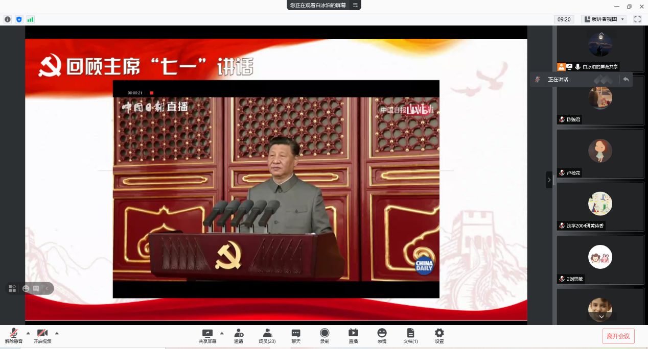 2021年9月16日上午十点,法学2004班通过腾讯会议开展主题为“重温讲话精神,学习法治思想”的线上学习活动。会议由班长白冰泊主持,法学2004班全体同学参会。