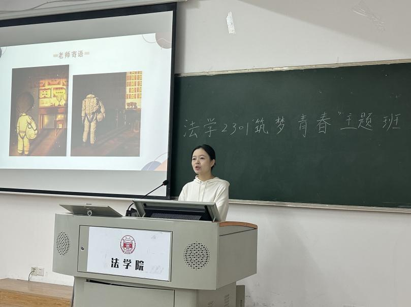 法学2301班班长杨家君同学以四个问题开篇:“你还记得小时候的梦想吗”“为了这个梦想,你付出过哪些行动”“你现在的梦想是什么”“作为新时代中国青年,我们的梦想应当是怎样的”,引导同学们思考自身理想与个人付出的关系,鼓励同学们付诸实践,让梦想不止于空想。班主任李婧嵘老师对法学2301班同学进行全体寄语,对法科学生的专业学习与生涯规划进行详细说明。她表示,个人价值的实现应当与国家的前途联系起来,而个人理想也与国家未来密切挂钩,鼓励同学们应当"与自己对话",立足当下的需求,追寻自己的本心,坚定理想并不断为之奋斗,努力成为一个内心富足的人。辅导员龙芷蔚老师总结,希望同学们深入思考如何有意义地度过大学四年,激励同学们不断提升综合能力素养,放飞梦想,追逐青春!