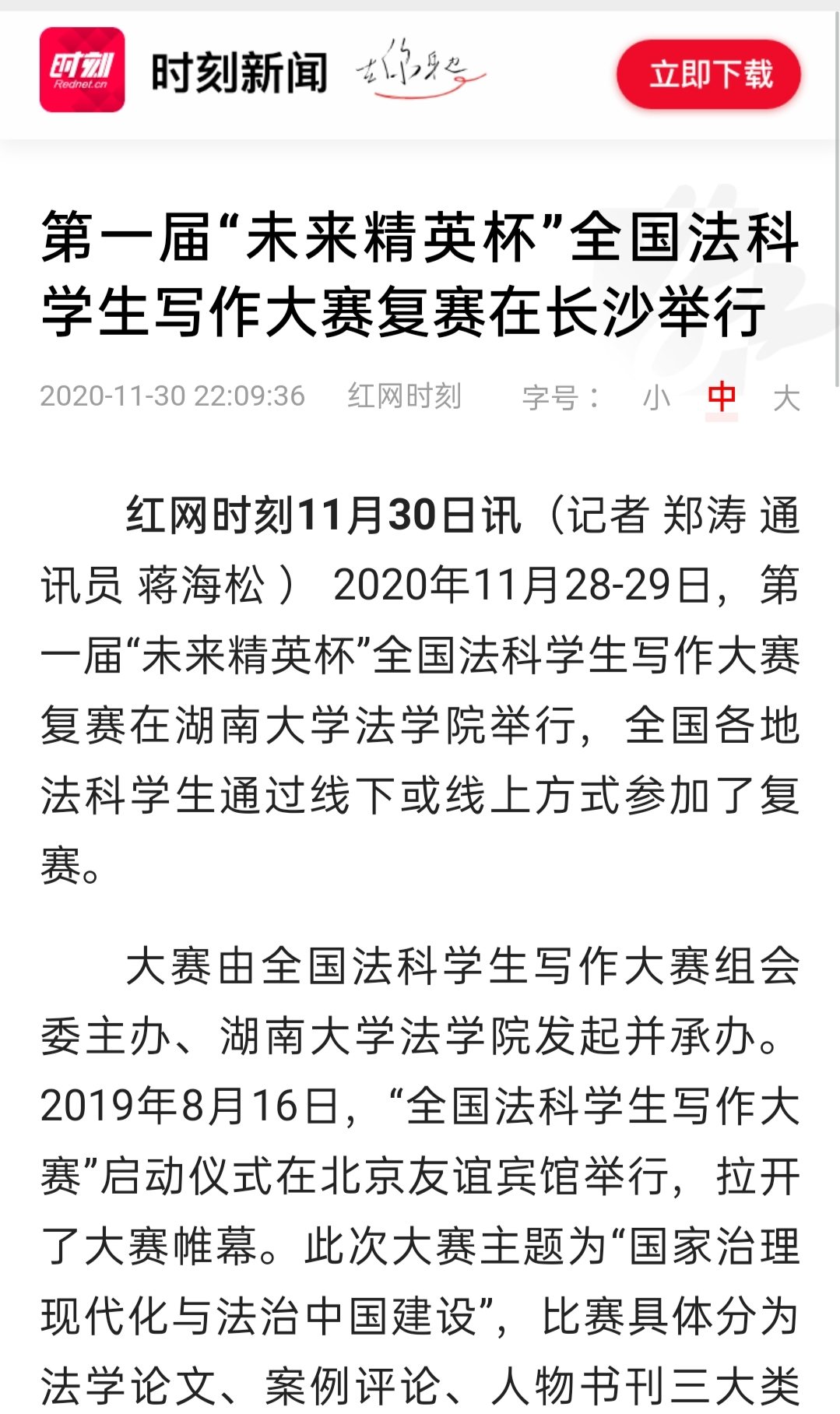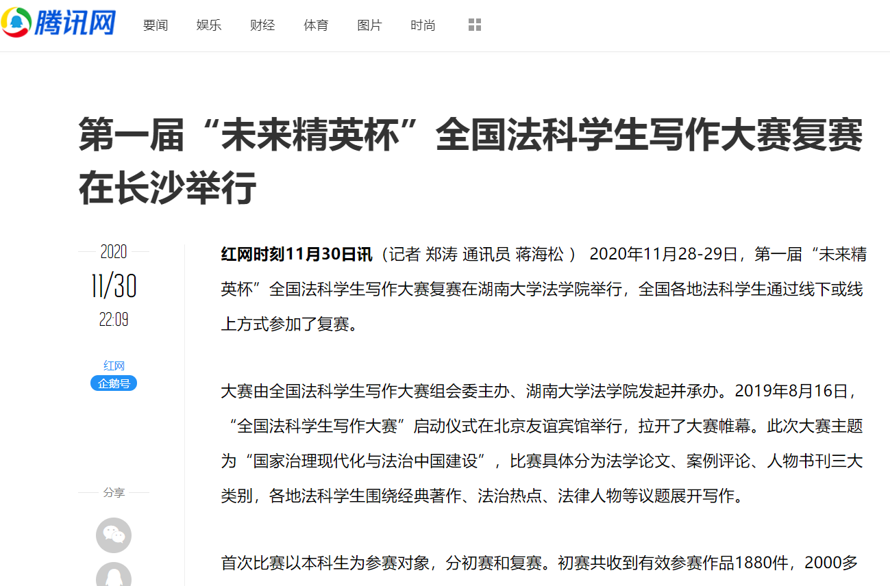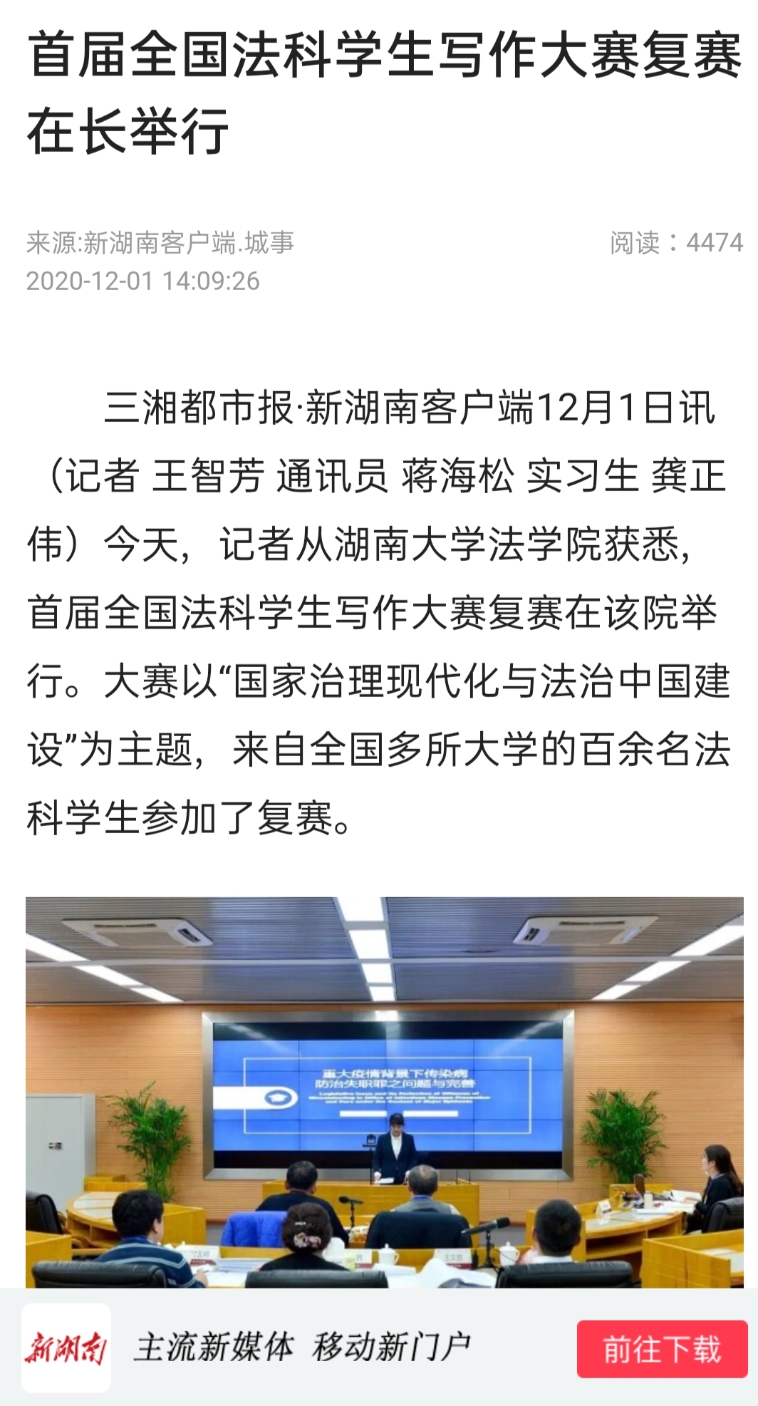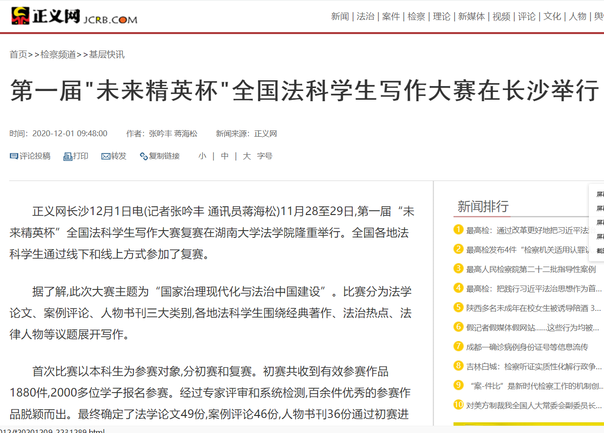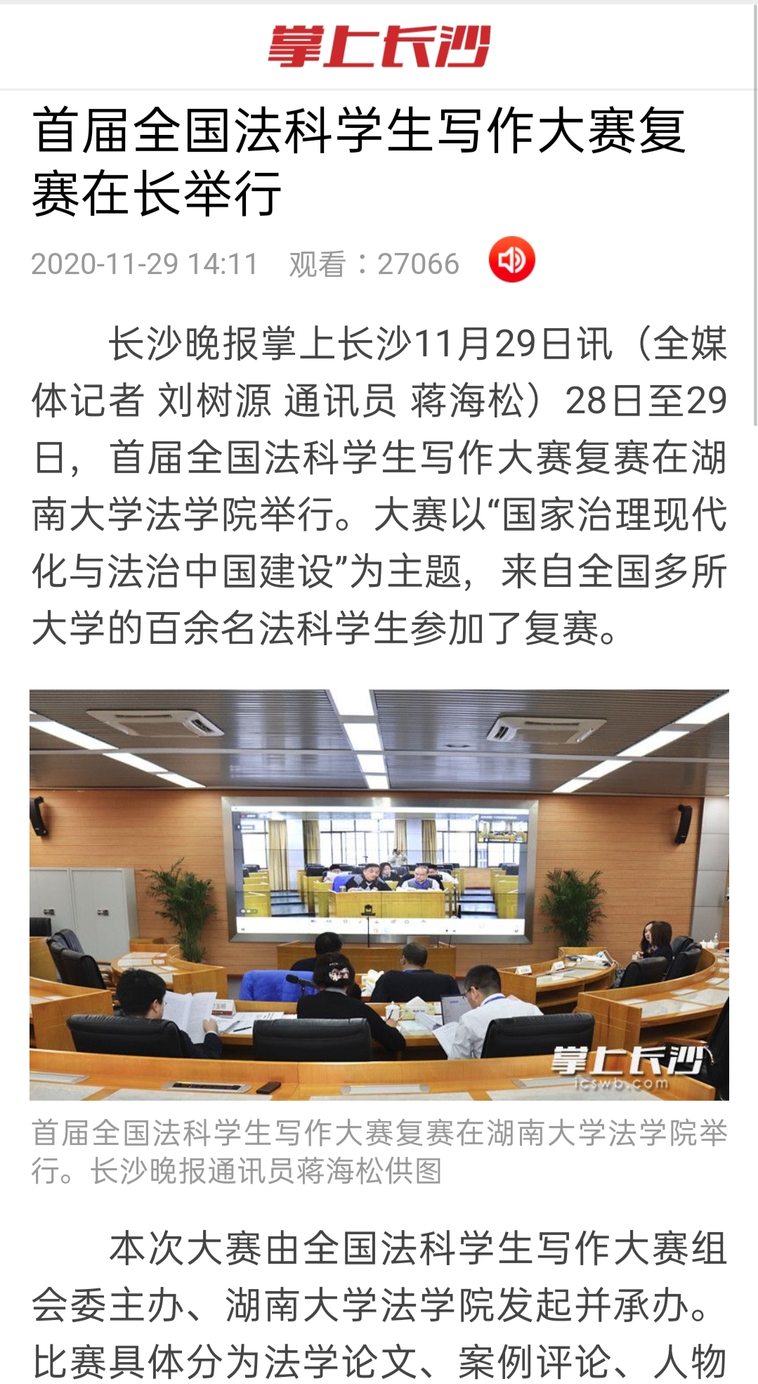 “全国法科学生写作大赛”复赛的成功启动引发全国媒体密集报道。据不完全统计,已有中国新闻网、《光明日报》、法制网、正义网、《法治周末》、《法制周报》、《长沙晚报》、《三湘都市报》、新湖南客户端、红网、腾讯网、华声在线、掌上长沙、 海角社区