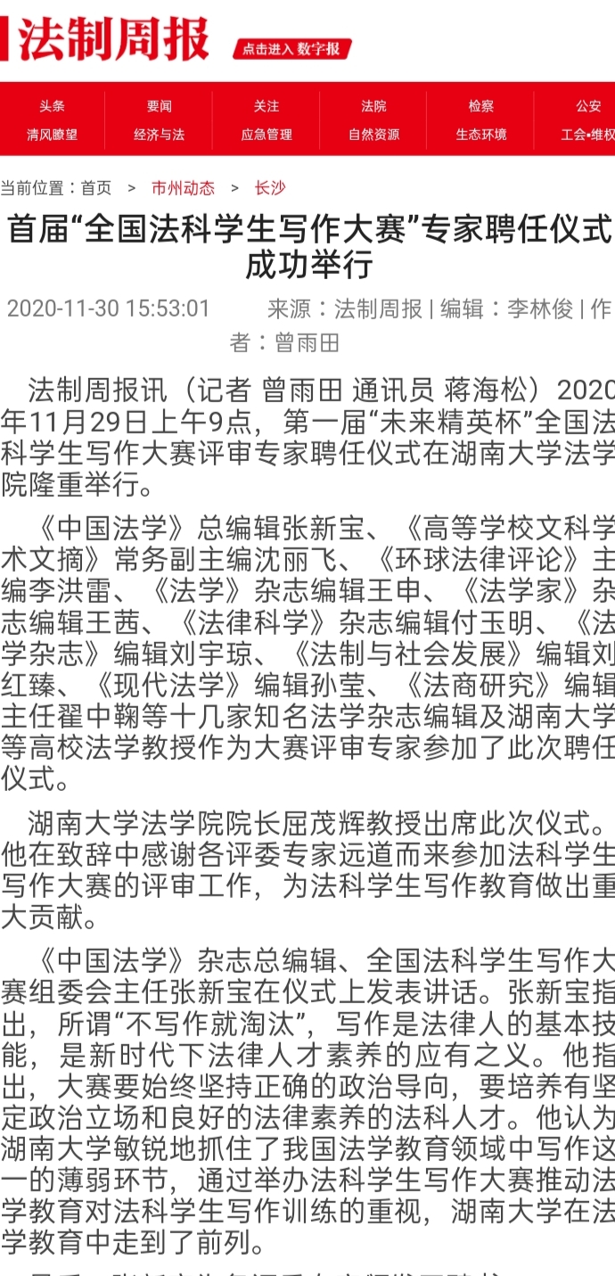 新闻网等全国二十多家媒体的报道。《法制周报》连续推送了几条报道,《法治周末》推出了题为《法科学生的论文中,这些新生事物是高频词》长篇学术通讯。