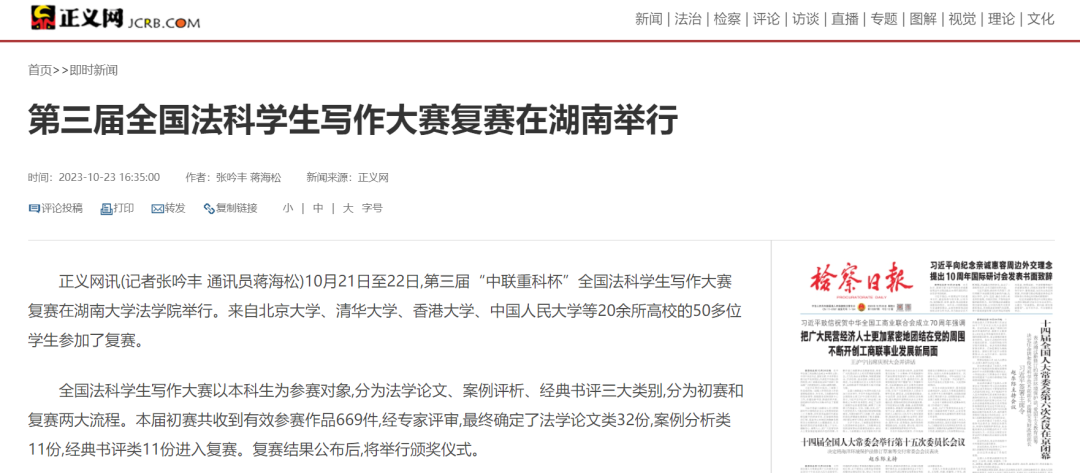 全国法科学生写作大赛以本科生为参赛对象,分为法学论文、案例评析、经典书评三大类别,分为初赛和复赛两大流程。本届初赛共收到有效参赛作品669件,经专家评审,最终确定了法学论文类32份,案例分析类11份,经典书评类11份进入复赛。复赛结果公布后,将举行颁奖仪式。