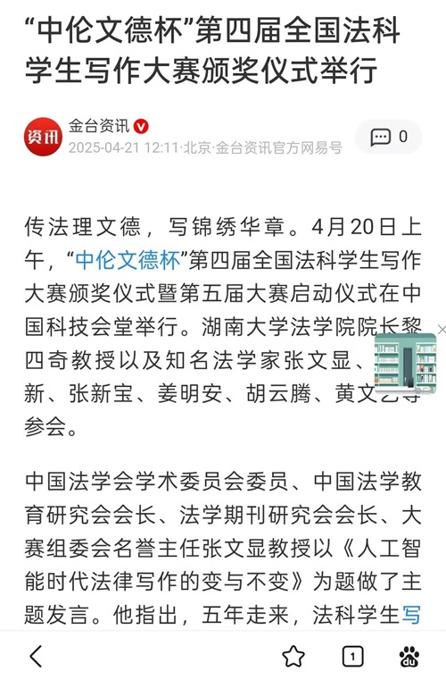 传法理文德,写锦绣华章。2025年4月20日上午,“中伦文德杯”第四届全国法科学生写作大赛颁奖仪式暨第五届大赛启动仪式在北京中国科技会堂举行。 “全国法科学生写作大赛”由大赛组委会主办、 海角社区