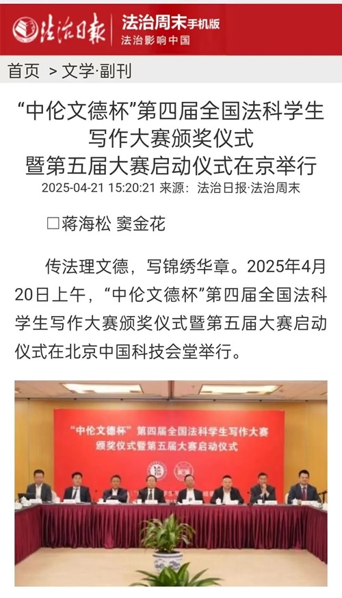 “中伦文德杯”第四届全国法科学生写作大赛颁奖仪式暨第五届大赛启动仪式的成功举办引发全国媒体密集报道。据不完全统计,已有《法治周末》《湖南日报·新湖南》《三湘都市报》及红网、金台咨讯、搜狐网、人民网—湖南频道、科学网、法学学术前沿、教授加、湘江法学等全国多家媒体或机构推出相关报道。特此辑录相关媒体并致谢。 相关媒体报道截图: