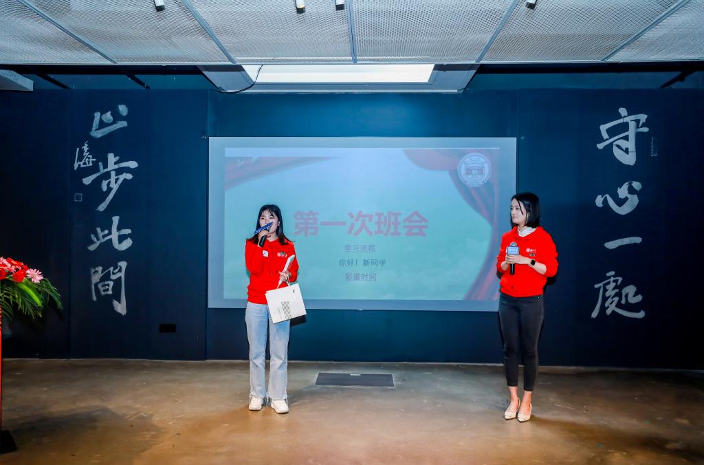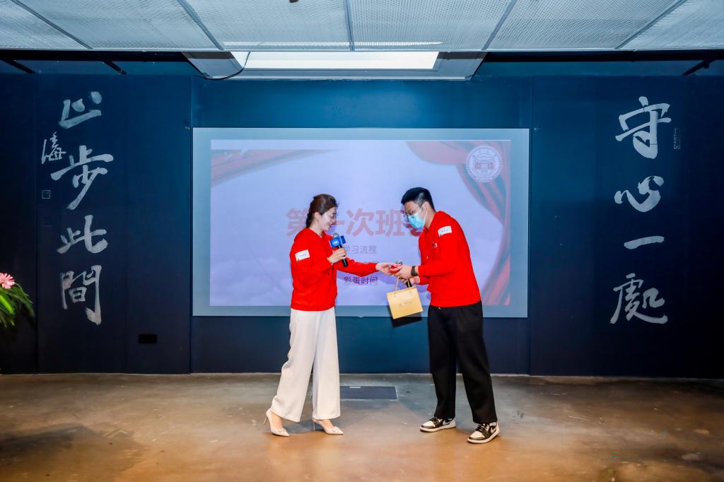 接下来,在班主任张老师的带领下开展了班级会议。班级会议主要分为三个部分,第一个部分张老师向大家详细梳理了学习流程。第二个部分是“你好新同学”,由介绍完毕的同学抽取出下一组新同学上台来进行一个简单的自我介绍和礼物交换活动。第三个部分是彩蛋环节,部分任课老师们虽不能至现场,但提前为同学们录制了欢迎视频并赠予亲笔寄语的笔记本,对同学今后的学习给予了非常殷切的期待和一些指导。