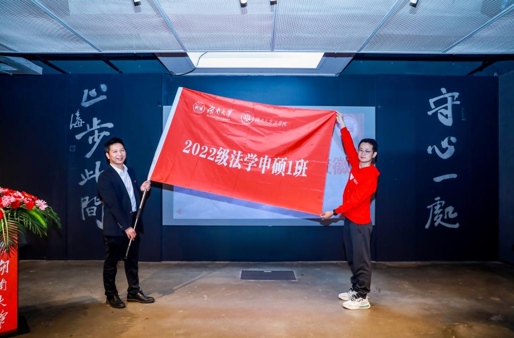 副院长湛建云亲自为22级法学申硕1班授予班旗,鲜红的班旗在学生代表手中挥舞。