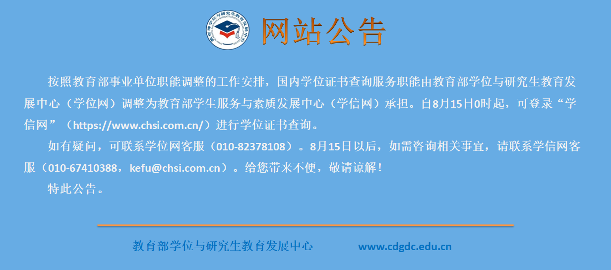 据中国高等教育学生信息网(学信网)消息,按照教育部深化事业单位改革工作安排,国内学位信息查询与认证服务职能由教育部学位与研究生教育发展中心调整为教育部学生服务与素质发展中心负责,查询与认证服务网站将由“学位网”调整到“学信网”。“学信网”拟于8月15日起开展学位查询与认证服务。