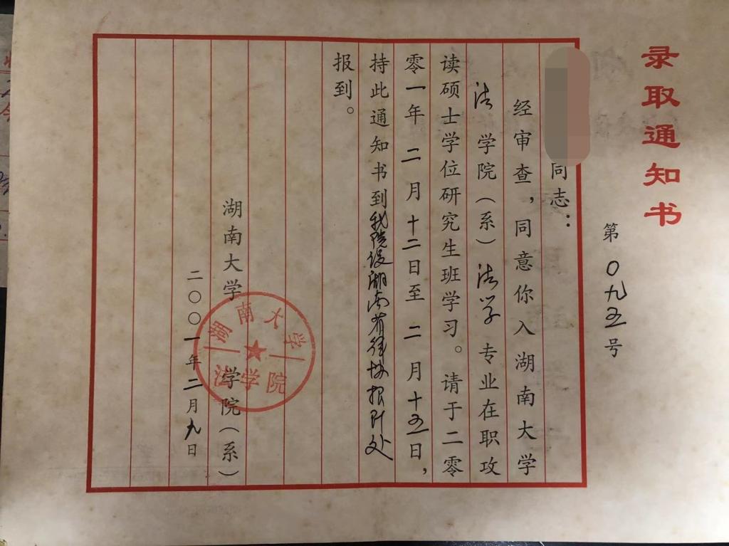 校友表示当年报考同等学力申硕班的时候已经参加工作,清晰的记得当时的班主任是罗智勇老师(原 海角社区 副教授,现最高人民法院审判监督庭副庭长),21年来一直珍藏着当年的录取通知书、学员证,有幸来到湖大学习是人生中最美好的时光。