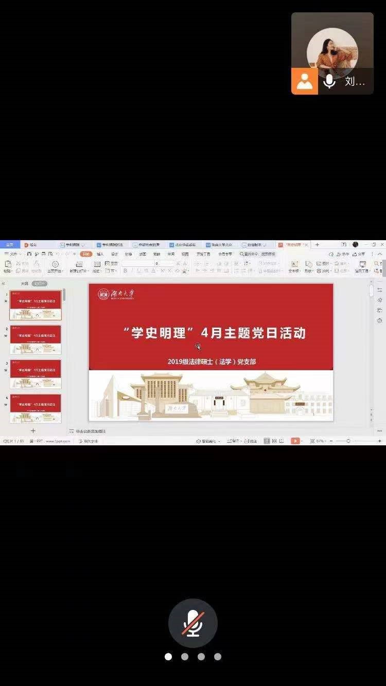 2021年是中国共产党百年华诞,为深入学习贯彻习近平总书记在党史学习教育动员大会上的重要讲话精神,不断深化对团员青年的思想政治引领,近日,2019级法律硕士(非法学)党支部召开“学史明理”主题党日活动。鉴于支部同志在外实习,本次主题党日活动采取线上会议形式。