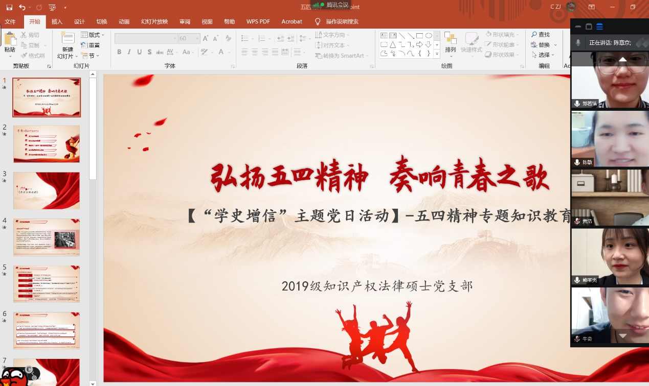 2021年5月15日,2019级知识产权法律硕士党支部在腾讯会议平台举行以“五四精神”为主题的党史学习教育活动,7位党员参加(含2名预备党员)
