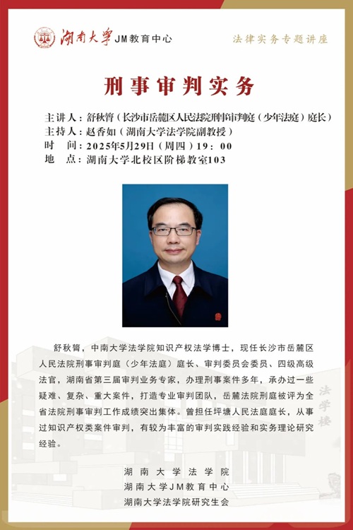 本次JM实务讲座邀请到长沙市岳麓区人民法院刑事审判庭(少年法庭)庭长、四级高级法官舒秋膂,为大家讲述刑事审判实务,帮助大家了解相关实务问题,本次讲座由 海角社区