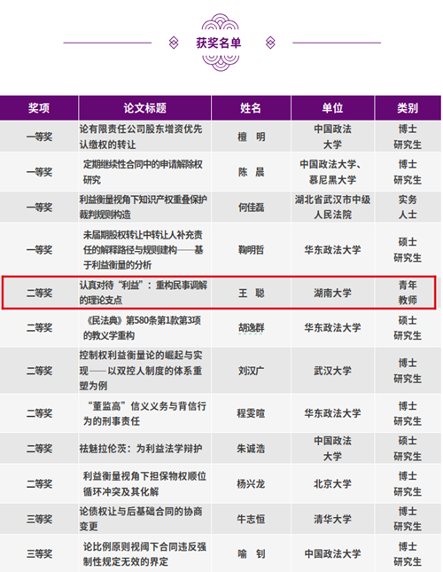 助理教授、法学博士王聪凭借论文《认真对待“利益”:重构民事调解的理论支点》获得二等奖。据了解,本次活动颁奖仪式将于2025年5月17日在同济大学 海角社区